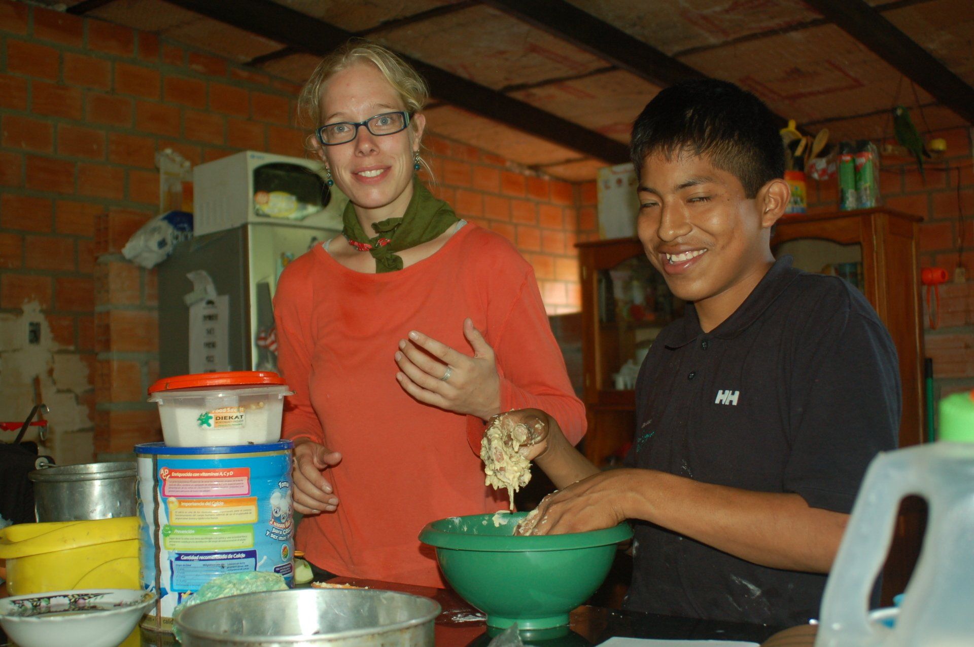 Sinds april 2012 zijn de eerste jong volwassenen binnen het project begeleid. Moises van 18 werkte als chef in de keuken. We leerden hem koken, wat hij helemaal geweldig vond. Hij maakte vooral hele lekkere soep. Toen de tijd aangekomen was dat hij ook hoofdgerechten zou gaan maken, is hij verhuisd met zijn moeder naar een andere stad en kon hij jammer genoeg niet meer bij ons werken. Jimena komt ook sinds april 2012 bij ons. Eerst hielp ze Trinke als assistent bij het speciaal onderwijs, maar al snel (toen we een auto konden kopen en vervoer mogelijk was) ook in het huis in San Isidro. Zij wordt opgeleid in alles m.b.t. de huishouding. Ze helpt mee schoonmaken, opruimen, maar ook koken. Ze vindt het erg leuk bij ons en ze doet het steeds beter. Jimena was 14, toen ze niet meer mee kwam op school. Ze is (met moeite) tot groep 6 gekomen.